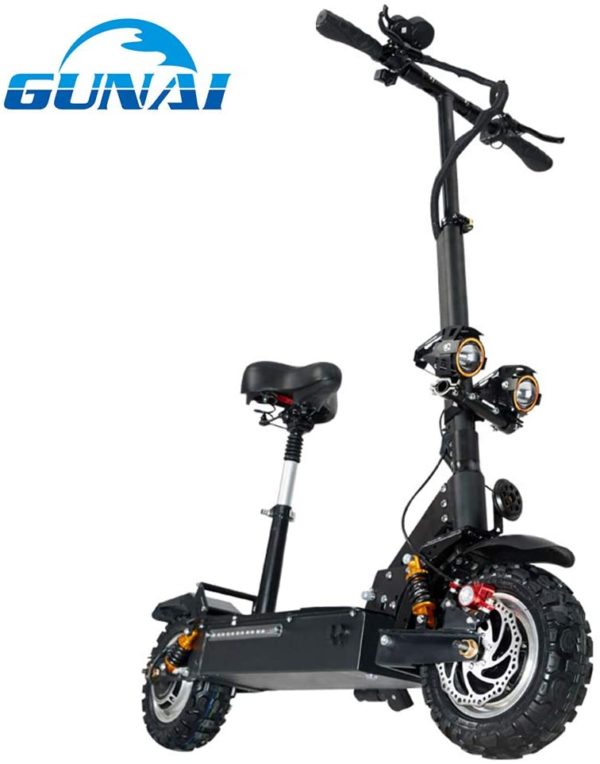 This is a Gunai electric scooter for adults. It has a 60v 24Ah lithium battery which can be charged in 5-6 hours and can cover up to 90km and can go up to 85 km/h. It has double drive front and rear integrated brakes which give easy control. It also has a headlight and taillight to make it even safer, particularly in dimly lit conditions. It has 1-inch vacuum tyres which are off road capable so they can run on rough roads and mountain hills. It has shock absorbing support to make it a comfortable ride. The saddle and handlebar are adjustable.