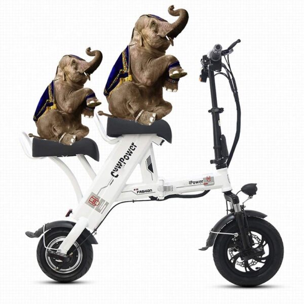 This is an electric bike which comes in white or black and has two seats. It folds up and takes up very little room so can be fitted into the boot of a car. The frame is made from steel and chrome nickel so is strong. It has a 500w motor to provide great speeds between 0 – 30km/hand a range of up to 70km. There is a hydraulic shock absorber on the front wheel and double spring on the back so that the ride is still comfortable even if it is bumpy. The tyres are wear resistant, anti skid and hard so they are safe and last well.