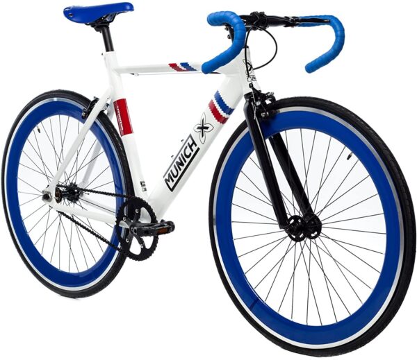 Kids will love this racing bike which comes in white and blue with some red accents. It comes in a 160-175cm size. It has an aluminium frame and double-wall rims which means that it is light and therefore easier to handle. It has 700mm tyres which have spokes and have brakes on the front and rear. The wheel can be fixed or free depending on how it is set up. The saddle matches in with the frame and comes on an adjustable seat post so it can be raised as the child grows. The handlebars are curled like on an adult racing bike.